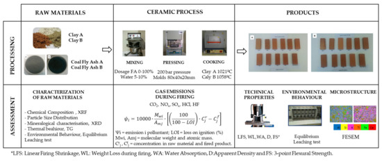 The methodology used in this work is represented in Figure 1. Both clays were subjected to a grinding process to achieve a particle size exceeding 0.5 mm clay A and 1 mm clay B. The mixture of raw materials, fly ash, and clay was realised with a laboratory mixer Raimondi, Iperbet model. The proportions of raw materials were calculated by weight and the necessary water was added to obtain a plastic mixture (between 5 and 10% of moulding water). The mixture was processed by pressing in a hydraulic press Nanetti Mignon model SS/EA, which reaches 200 bar pressure and prismatic moulds with dimensions of 80 × 40 × 20 mm. The samples were dried for 30 h at 105 °C before the firing cycle, using a laboratory muffle furnace Hobersal, PR Model 12/300 capable of ramp temperature versus time of up to 16 points. Industrial firing cycle was provided by the ceramic companies reaching temperatures of 1021 °C for clay A and 1058 °C for clay B.