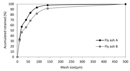 Particle size of quarry clays was less than 0.5 mm in clay A, and 1 mm in clay B, with average particle sizes of 180 µm and 220 µm, respectively. The particle size distribution of fly ashes is given in Figure 2. FAA had a lower particle size than FAB (average particle size of 65 µm of FAA versus 111 µm of FAB). FAA showed 4% ash particles above 100 microns; 23% of particles between 63 and 100 microns; and 73% of fly ash with a particle size below 63 microns. Instead, FAB had 25% of particles with sizes greater than 100 microns; 23% with sizes between 63 and 100 microns; and 52% of particles with sizes lower than 63 microns.