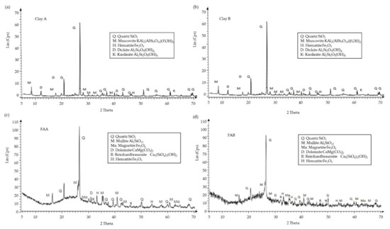 Mineralogical analysis of raw materials is shown in Figure 3. The mineralogical analysis of clays A and B showed an amorphous fraction in the form of maximum width between 15 and 30 degrees. On the other hand, the crystal phases present were mainly quartz (SiO2), muscovite (KAl3Si3O10(OH)1.8F0.2), dickite (Al2Si2O5(OH)4), and kaolinite (Al2Si2O5(OH)4). These phases can constitute approximately 90% of the total clay, respectively. Furthermore, minority phases are iron oxides (Fe3O4). FAA and FAB showed an amorphous fraction in the form of maximum width, much larger than clays, between 15 and 30 degrees. On the other hand, the crystal phases present were mainly quartz (SiO2), mullite (Al4+2xSi2-2xO10-x being x≈0.4), and anhydrous aluminium silicate (Al2O7Si2). These phases can constitute approximately 70 and 50% of FAA and FAB, respectively. Furthermore, minority phases were dolomite CaMg(CO3)2, calcium aluminate (xCaO yAl2O3 being x and y the number of molecules), calcium silicate (2CaO.SiO2), and iron oxides (Fe3O4).