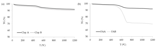 Thermogravimetric behaviour of (a) clay A and clay B; (b) FAA and FAB.