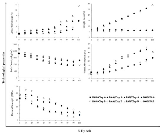 The effect of unburned carbon of fly ash on the linear shrinkage is shown in Figure 5. FAB/clay ceramics present a higher value of linear shrinkage for percentages of fly ash greater than 50%. There was a difference over three units between FAA and FAB for both clays. For concentrations between 10–50% of fly ash, fired clay ceramics with FAB had a linear shrinkage close to the bricks with FAA. The difference between ashes was lower than 0.5 units and presented a linear shrinkage close to the bricks with 100% clay. The same tendency of increasing the linear shrinkage, due to the addition of waste, has been observed in other studies [53].