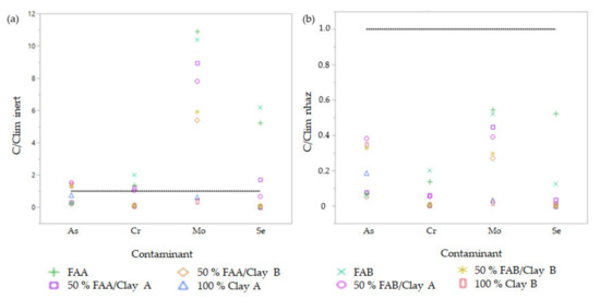 Once a leaching test was applied, the elements that exceeded the limit of the inert waste landfill on raw materials were studied (Table 3). The contaminants associated with fly ash were Cr, Mo, and Se, as shown in Figure 6a. Introducing fly ash into fired clay bricks in a dosage of 50% reduced the mobility of Mo and immobilised Cr and Se below the inert waste limit. The concentration of As for fly ash was below the limit of inert waste landfill, but when incorporated into the ceramic bricks in 50% of FAB, it exceeded it. The 100% clay B was above the inert waste limit, so clay B was the raw material, which favours that the 50% FAB/clay B bricks exceeded this limit. The content of unburned carbon did not influence the mobility of contaminants.