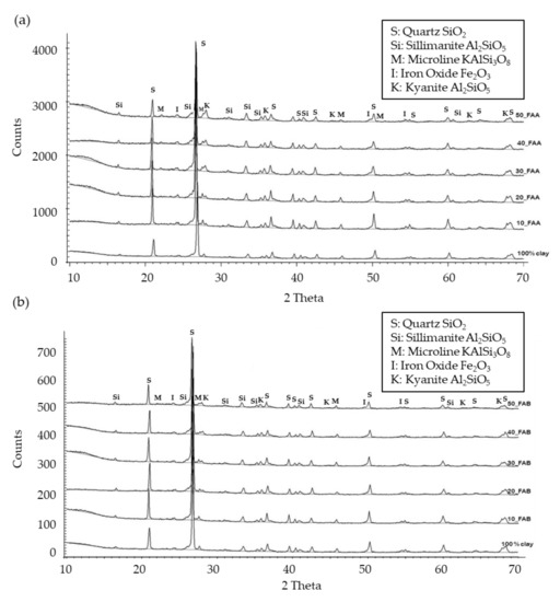 Figure 7 shows the XRD patterns of ceramic brick compositions with 10–50% FAA, 10–50% FAB, and without fly ash, only 100% clay B that were fired at 1058 °C. The mineral phases of the bricks were identified as quartz, sillimanite, microcline, kyanite, and iron oxide (hematite).