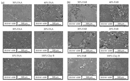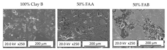 Figure 8a,b shows the microstructure observed by FESEM on the polished surfaces of FAA/clay and FAB/clay bricks, respectively. The main microstructural effect was the increase in porosity as the content of coal fly ash in the brick body increased. The increase in porosity was mainly associated with the presence of dolomite and unburned carbon in the mineralogical composition of the fly ashes (Figure 3).