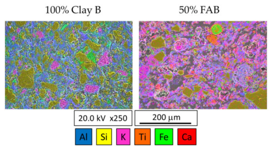 The incorporation of fly ash into the brick composition affects not only the porosity of the fired pieces but also their crystalline composition and the distribution of crystalline phases. Figure 10 presents the FESEM images of polished and etched fracture surfaces of samples of 100% clay B and 50% FAB/clay B compositions, together with the mapping of the elements Al, Si, K, Ti, Fe, and Ca. The different crystalline phases that comprise the mineralogical composition of the fired bricks were clearly distinguished by the colour differences caused by the varying concentrations of these ions in each of the crystalline phases. The 100% clay B sample shows the conventional phase distribution in traditional fired clay materials composed mainly of quartz grains embedded in a ceramic matrix enriched in aluminium oxide.