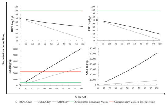 The introduction of fly ash in the mixtures produced an increase in SO2 emissions due to the high content of S present in the fly ash. The FAB/clay mixtures showed extremely high levels due to the presence of the combination of different sulphur associated with inorganic, pyritic, and organic carbon.