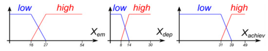 where Ri is consequent rules; xem, xdep, xachiev are input values from the MBI questionnaire for certain groups of questions, respectively: “emotional exhaustion”, “depersonalisation”, and “lack of personal achievements”; and e is evaluation partial value as the result of the rule.