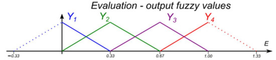 As we have two possible output values from the three first-level systems, the final system has 23 rules. Thus, the top-level fuzzy system uses the same evaluation output variable as in the Proposition 1—E = {Y1, Y2, Y3, Y4}. The rules are as follows: