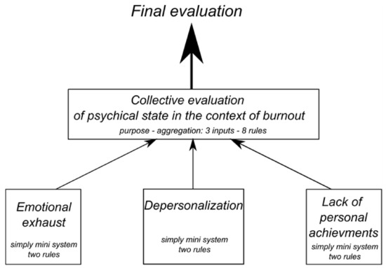 The next evaluation model was extended to the hierarchical fuzzy construction. It simplified the evaluation of certain groups—some effects of burnout according to the MBI method. At the lower level, we have three mini fuzzy systems with two rules each. Their role is to evaluate each parameter separately, then its result is transferred as input to the next level fuzzy system, whose role is to aggregate the partial evaluations into one global evaluation of psychological state of the given person. A general structure of the proposed fuzzy system is presented in Figure 3. The first level is two very simplified SISO fuzzy systems, with two fuzzy input values—the same as in the previous solution. As for the output variable, we use two values: Y1 = (0, 0, 0, 1), and Y2 = (0, 1, 1, 1). Moreover, as before, they are extended for the purposes of simplifying the calculations, to make defuzzification by centre of gravity fit into interval [0;1].
