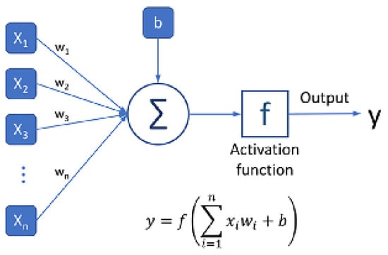 The basic architecture of a CNN consists of different convolutional layers, in addition to pooling layers and fully connected layers. The convolutional layer aims at taking or extracting features from the input data. To achieve the featured maps, we reiterate the process starting from the input image and then calculating the dot product considering the weights and biases. The formula for computing a single output matrix is described as follows in Equation (1):