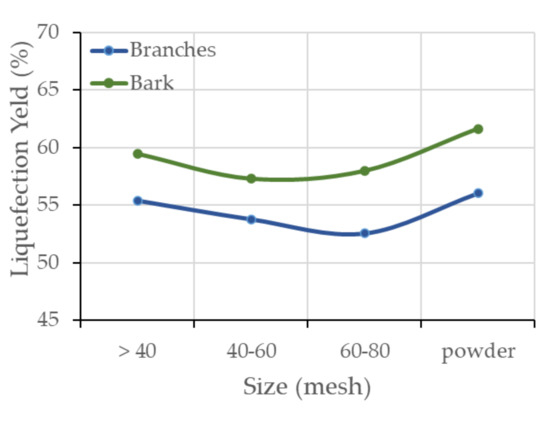 Figure 3 presents the variation of the liquefaction yield in relation to the size of the particles. Results show that the particle size has no significant influence on the liquefaction yield and for the samples of bark and branches a similar yield of 61.6% and 56.0%, respectively, could be achieved using fractions of <80 mesh. The size of the samples is generally important when the chemical composition of the various fractions is very different, which happens, for example, in the bark of Pseudotsuga menziesii, which has a higher cork content in the larger particles than in the smaller ones. Results presented by Miranda et al. [63] show that the chemical composition of fine (F, <0.180 mm), medium (M, 0.250–0.450 mm), and coarse (C, >2 mm) fractions differs mostly in the extractive content and there is only a smaller percentage of lignin and therefore higher holocelulose content in the coarse fraction. That work demonstrated that, theoretically, the coarse bark fraction would be more easily liquefied than the fine fraction by looking only at the chemical composition. However, in finer fractions, the reaction should be faster due to the better accessibility of the chemicals to the material. This equilibrium might justify the results presented in Figure 3, because there is a slightly higher liquefaction yield in the coarse (<40 mesh) fraction, decreasing further for the 60–80 mesh fraction, and increasing for the fine (<80) fraction.