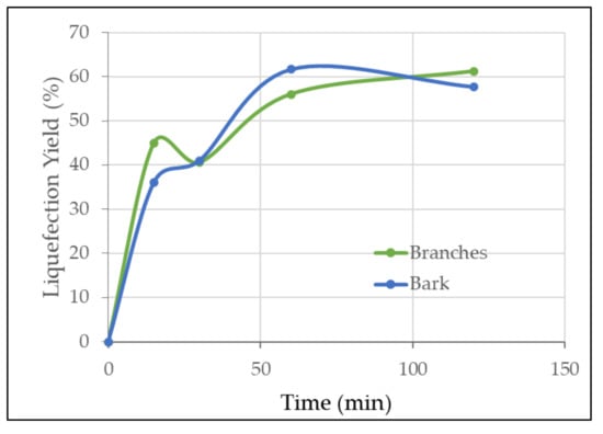 The variation of liquefaction yield along the treatment was studied for a liquefaction at 180 °C. Figure 5 shows the variation of bark and branches liquefaction yields for 15 min, 30 min, 60 min, and 120 min of treatment. It was found that for the bark sample, the best yield was obtained for 60 min and 180 °C (61.6%), while that for the branches the best yield was obtained for 120 min and 180 °C (61.2%). No significant difference was observed between bark and branches which is probably due to the relatively similar chemical composition of both residues as seen before. According to Hu et al. [71], in the first reaction stages, hemicelluloses, lignin, and amorphous cellulose are liquefied due to their better accessibility to chemicals while crystalline cellulose needs longer reaction time.
