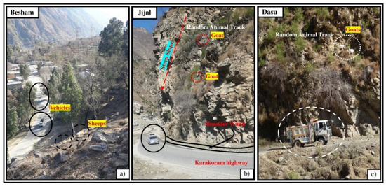 Quantification of rockfall activity caused by animal movement at lower and higher altitudes. (a) Sheep grazing at the gentle slope and lower altitude can push stones, which might cause moderate damage. (b,c) Stone falling caused by goats grazing at the steep slope and at the random track can directly damage the vehicles.
