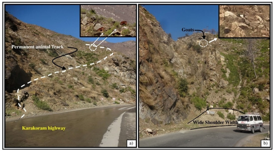 To quantify the animal activity along the study area at shallow or higher altitudes, a strong emphasis was given to animal movements, locating their random and permanent tracks, grazing altitude and steepness of the slope, and the shoulder width of the road (Figure 1 and Figure 2). From Besham to Dasu, much of the slope is steeper, therefore the stones reaching the road is primarily controlled by grazing height plus the shoulder width. In some cases, grazing animals at higher altitudes push stones that are captured by shrubs during downslope movement. Conversely, a large stone pushed from a higher altitude might gain momentum and becomes dangerous for humans and vehicles. A higher rating has been given to the situation when animals are grazing very close to the road and at shallow altitudes with no or extremely low shoulder width. In this situation, even a small stone directly approaches the road very quickly (Figure 1). A minimum score is assigned in the case where grazing will take place at shallow or higher altitudes, but the chances of falling stones reaching the road is minimal. This is mainly due to the gentle slope and plentiful shoulder width. (Figure 2). In mountainous regions, as with the KKH, shoulder width plays an important role in accommodating falling stones. In the study area, shoulder widths do not have standard limits and are therefore classed as a major factor in the quantification of rockfall by animal activity.