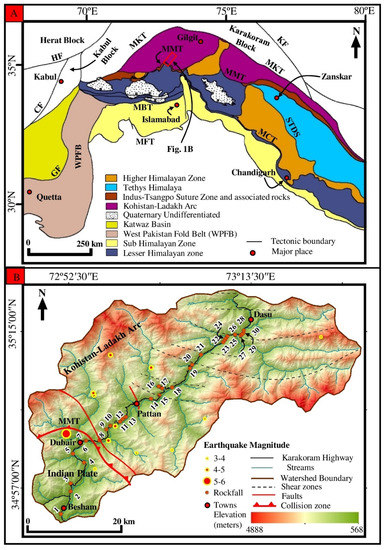 North Pakistan is a geologically complex area due to the active head-on collision of three blocks, i.e., the Indian plate, the KIA, and the Eurasian plate [29]. The Indian-Asia collision is the major tectonic event that has resulted in crustal shortening, the formation of major active faults, and subduction in the region [53]. The study area lies within the northwest Himalayas, where the crustal thickness increases from the south to the north due to collision [29,51]. The Kohistan and Ladakh Island Arcs in north Pakistan are sandwiched between the Indian plate and the Asian plate. The Indian plate is subducted under the Karakoram block of the Eurasian plate. This has caused crustal shortening and crustal thickening. Active ongoing deformation is manifested by the active seismicity across the northwest Himalayas, Karakoram, and Hindukush [54]. The study area is part of the KIA, traversed by the KKH with general geological units from south to north.