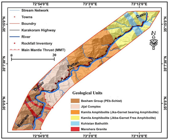 The study area is located in the Kohistan district and is a 78 km stretch of the KKH in the Indus Valley. (Figure 3). The study area is bounded within the longitudes 72°51′49.44″ E, 73° 13′19.55″ E and latitudes 34°54′42.48″ N, 35°16′22.46″ N. Altitude in the area ranges from 568 m ASL at Besham to 4888 m snowy peaks on both sides of the Indus River. The world’s ninth highest mountain peak, Nanga Parbat, with an elevation of 8125 m, is located in this region. Nanga Parbat Haramosh Syntax, located over a peninsula of the basement of the Indian plate, divides the Kohistan and Ladakh Island Arc terranes. The valleys in Kohistan have steep slopes and thin dispersed alpine-type vegetation, with snow cover mostly in the winter season [51]. The Indus River is the main drainage artery of the area.