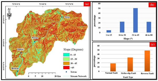 The main factors of rockfall and debris slide are the highly fractured hard rocks of steep slopes. Due to the slope factor, failures along the fractures are common in the Indus gorge and especially in the study area. Rockfalls and debris slides are accelerated by ground-shaking due to earthquakes and facilitated by heavy rains in the region. This steep slope promotes rockfall activity and is mostly concentrated along the highway from Dubair to Dasu (Figure 5a). The slope percentage of the two upper classes, i.e., 30° to 45° is 50.45% and 45° to 70° is 22.18%, which collectively makes 75% of the slope in the area, is greater than 30° (Figure 5b). Compressive stresses (thrusting) due to convergence are dominant, followed by strike slip and extensional stresses (Figure 5c).