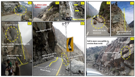 An overview of the measurement of field parameters for the RHRSP model. (a) A bus was damaged by a rockfall in the Kohistan district. (b) A planar joint surface. (c) Continuous water on the slope is a source of constant disruption of the road. (d) block size or volume per event is measured in the field. (e) Vertical height of the slope is measured rather than slope length. (f) Hanging block will directly hit the vehicle or human from a steep slope with an ineffective ditch. (g) Overhanging slopes and sharp horizontal curves restrict the Decision Sight Distance (DSD). (h) Multiple fracture sets are measured in the field. Soils are more susceptible to erosion. Wedge type is a common mode of failure.
