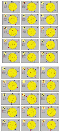 Similarly, in the last minor group, which is located in the northern exposure of the Kamila amphibolite, the fracture data at stations 22, 24, and 28 shows north-northeast–south-southwest and northwest–southeast directed thrusting dominance, while the data at stations 25, 26, 29, and 30 show strike-slip dominance, and the data at stations 23 and 27 shows extensional dominance (Figure 1 and Figure 7).