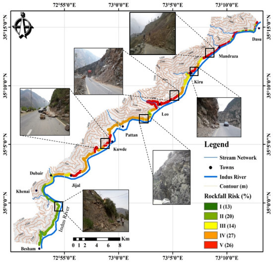 According to [63], the risk is defined in terms of the exposure of the elements at risk, their vulnerability, and most importantly, the hazard. In RHRS, which is the most well-known rock hazard evaluation method, the risk parameters are associated with traffic conditions, mainly AVR, PDSD, and ditch effectiveness, etc. Furthermore, the risk is directly linked to the exposure of vehicles on the road, which is rated through assigning scores to various parameters [27]. Risk assessment of an area assigns it a level of risk, which provides a way for planners to minimize, control, and monitor the probability of future geohazards [64]. The final rockfall risk assessment map along the highway is shown in Figure 9. The hazard and risk zones are more or less similar in pattern along the entire highway stretch. The zone falling in the very high- to high-risk category starts from the Jijal complex to Kuwde, Pattan, Leo, Kiru, and Mandraza. Starting from Besham and passing through Khenai and Dubair are the zones of moderate to low risk. About 50% of the highway stretch is occupied by very high- to high-risk zones. It is also seen that 26% of the highway is under the low hazard zone and about 35% is under the low-risk zone. (Figure 8 and 9). Based on our results, it is clear that a major part of the highway falls under the unacceptable risk category that requires urgent remedial work. According to [22], the road must be prioritized based on the risk scores, but [27] mentioned that this prioritization should vary from place to place because, in our study area, the entire section does not fall under the same risk category. The Frontier Works Organization (FWO) has managed the KKH for decades and is responsible for removing any blockage due to natural hazards and for building and repairing roads. Different risk levels demand appropriate risk control measures. For risk level I, continuous monitoring is suggested daily and demands effective engineering measures for slope stability. Daily inspection, warning boards, and speed limit boards are required for risk levels II and III. Although risk levels IV and V fall within a relatively safer zone, an inspection of the slope once a month is recommended. Despite all safety measures, it is strongly recommended that the local community should be provided with information through social media campaigns, newspapers, and personal visits to enable them to tackle the natural hazards.