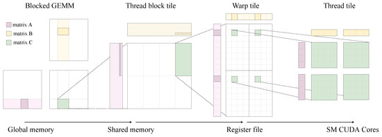 CUTLASS is a collection of templates coded in CUDA and C++ that abstract the high-performance matrix-multiplication implementation. This open-source and low-level library decomposes this algebraic operation into software modules using C++ template classes. These modules divide matrix multiplication into threads, warps, blocks, and device levels, as can be seen in Figure 2. This figure highlights the memory transfer in each iteration of the most external loop of the matrix multiply–accumulate (C += A × B). Additionally, CUTLASS allows tuning through custom data types, tiling sizes, and other algorithmic policies.