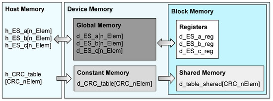 In Figure 3, we schematize the transfer of the CRC lookup table and the ESs across the memory hierarchy of the chosen platform. This transfer starts from the host memory, where it is initialized, to the shared memory, where it is finally accessed by each thread. Since GPU shared memory cannot be statically initialized, we initially store the CRC lookup table in constant memory before it is transferred to the shared memory at runtime. This memory presents a lower latency than global memory, especially in memory accesses where several threads access the same memory addresses consecutively. We can exploit this since the matrix–matrix multiplication executes as many blocks as k tiles it is decomposed in, and all these blocks store the CRC table in their own shared memory. Although the first block accesses occur serialized, the remaining blocks access the constant cache memory (which has the required 1 KB to store the entire table) that is faster than the global memory.