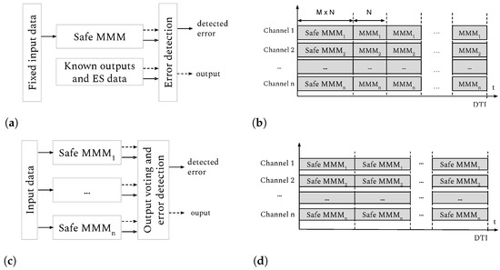 - Periodic diagnosis with design-time fixed data pattern(s): The ‘safe MMM’ is executed at least once every diagnostic time interval (DTI) (Figure 4b) with predefined design-time reference input data vectors that should lead to known reference outputs and an array of ESs values (see Figure 4a). This approach can be used in a single-channel architecture (HFT = 0) or in redundant architectures (e.g., triplicated architecture with HFT = 2). The error detection can be used to detect the erroneous channel prior to the voting process and application-specific measures can be implemented (e.g., restart erroneous channel, activate safe state);