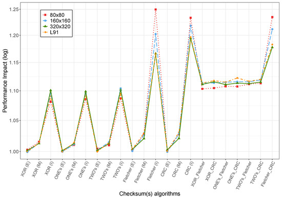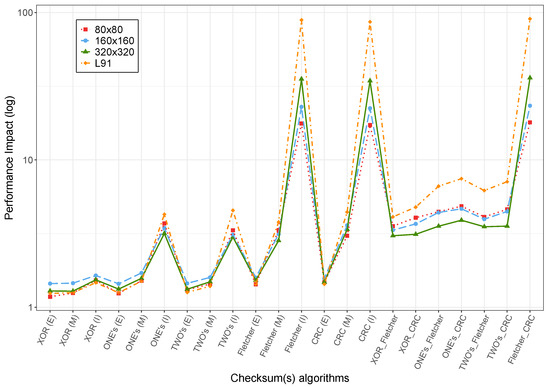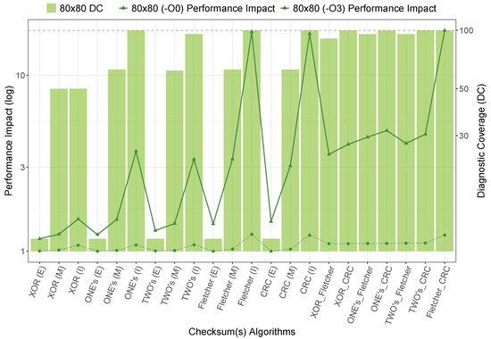 Regardless of the compiler optimizations, both reach the same DC. However, in -O0 experiments, we obtain performance impacts between 1.01 and 1.23 in contrast with -O3, which increases this range to 1.18–17.98. We can confirm that combining one’s and two’s complement checksums with Fletcher is not suitable, reducing DC in contrast with the single-internal-loop implementation of these diagnostics.