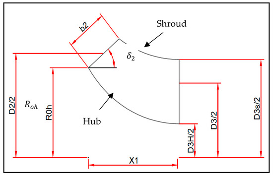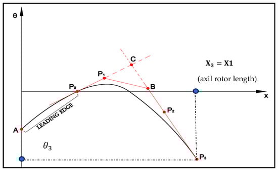To complete the remainder of the camber line, it is necessary to calculate the coordinates of items 0, 1, b, 2, and 3 (Figure 2) given according to the blade dimensions in reference [30], where the Bezier polynomial is used. The following forms are applied, where are axial and radial coordinates of items 0, 1, b, and 3 (Equations (6) and (7)).