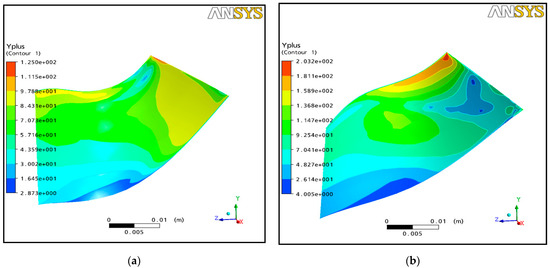 On the other hand, a variation in the total to static isentropic efficiency graph stabilizes with element numbers greater than or equal to 333,372 elements used in numerical simulations (Figure 6c). The turbulence model reliability of the mesh number used (333,372 elements) has been verified by the Y+ contours on intrados and extrados, where the majority of values Y+ are between 20 and 100 (Figure 8).