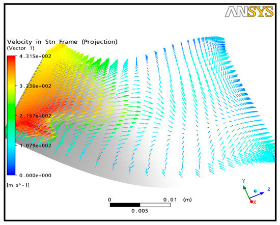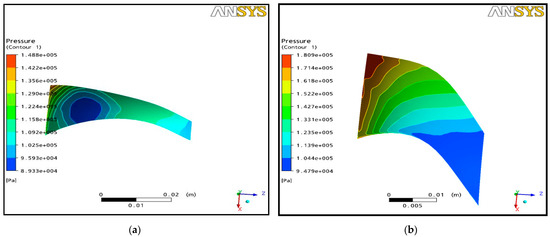 It can be observed that (Figure 20b) the gas seems to subsonic flow through a converging–diverging channel connection and later through a convergent form which causes acceleration in the converging part of the channel to a maximum relative Mach number—followed by flow deceleration in the diverging part of the channel. All the relative Mach number curves intersect at an axial distance from the inlet within the interval 0.01–0.015 mm, reflecting a starting state of the flow deceleration. Then, there is an acceleration in the convergent blade channel from an axial length of 0.025 m until the exit rotor. The relative Mach number behavior is probably due to the formation of the boundary layer near the blades at several places, making it possible to vary the passage section of the flow, which will cause converging or diverging passages. The pressure distributions around the blade profiles become more uniform with a more significant pressure difference between the pressure side and the suction side, which results in higher loadings at a full rotational speed (Figure 21a–c)).