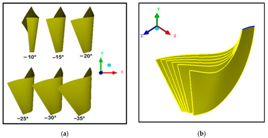 The new rotor wheels under study are designed by varying the deviation blade angle (−10°, −15°, −20°; −25°; −30° and −35°), which allows for a complete change of the camber line shape as well as the aerodynamic blade shape. The horizontal sliding of the new camber lines revealed that the actual length of the blade increased by increasing the deviation blade angle. Hence, the rotor becomes more prolonged and heavier. The new camber lines blade is shown in Figure 14. The three-dimensional shapes of the blades are configured in Figure 15a,b. The blade characterized by −25° deviation blade angle is considered a reference blade.
