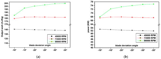 The investigation of the deviation blade effect: (a) output work for different deviation blade angles; (b) power for different deviation blade angles.