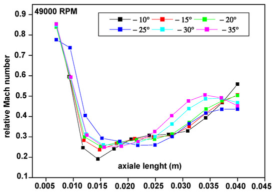 The variation of the relative Mach number along the axial direction of the flow for different deviation blade angles at a rotational speed of 50% is presented in Figure 19. It can be noticed that the gas seems to subsonic flow through a diverging–converging channel connection which causes a flow deceleration in the diverging part of the channel to a minimum relative Mach number located at the same axial distance from the entrance, equaling approximately 0.015 mm, followed by flow acceleration in the converging part of the channel. The variation of the relative Mach number between the exit and the rotor entrance is negligible for −10° of deviation blade case, which implies a minimal degree of reaction.