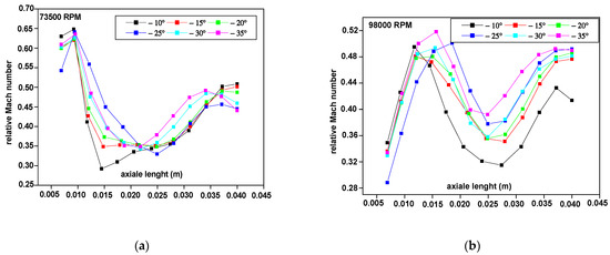 The variation of the relative Mach number along the axial direction of the flow for different deviation blade angles: (a) relative Mach number for different deviation blade angles at 75% rotation speed; (b) relative Mach number for different deviation blade angles at 100% rotation speed.