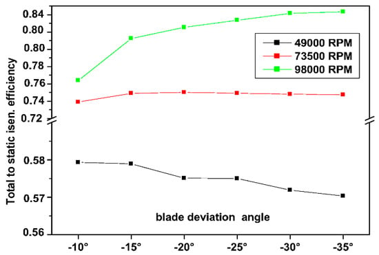 Total to static isentropic efficiency for different deviation blade angles.