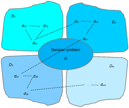 A decision problem is defined through decision variants and assessment criteria. According to literature sources [13,14] decision problems can be divided into problems with single-layer, hierarchical and fuzzy structures. A decision system is often a single-layer system with a closed decision problem [14,15]. Figure 1 illustrates a model of the first-type structure. Di are decision areas, dij are elementary decisions in particular areas, where i = {1, 2, …, n} and j = {1, 2, …, m}. Final decisions eliminate one another within the same decision area.