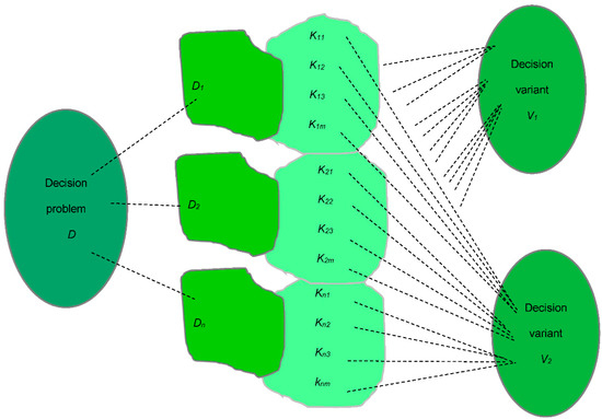 In most cases, this structure does not reflect a decision situation because decisions are taken in many areas, which means there are mutual relationships between decision problems Di. In many situations, these relationships may contribute to the quality of the final solution [16,17,18,19] Dependences between elementary decisions are depicted by a hierarchical structure of a decision problem, in which no sooner that all decision criteria of the lower-level Knm have been considered and solved can higher-level decisions be made and the final choice of decision variant Vi made (Figure 2).