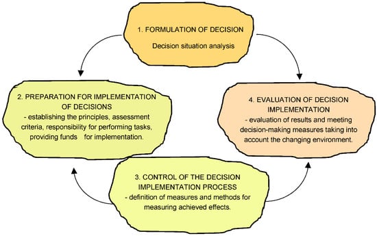 Business enterprises operate in an increasingly difficult environment, as the competition intensifies and markets are being made devoid of rules or principles. Big corporations more and more often dictate conditions in which businesses are run, both locally and globally. This tendency appears in all sectors, including the civil engineering segment [24,25]. A decision-making process is undergoing significant changes due to progressing globalisation. At all stages illustrated schematically in Figure 4, it is recommended to refer continually to the ever changing nearer and further environment. Increasingly often, the cutting edge information technologies, seen as tools of globalisation, are a source of information and datasets supporting the process of arriving at a decision [26,27,28]. Making a decision is a process that encompasses such activities as expressing the need for a decision, collecting and processing data to support the decision, measuring the outcomes and finally evaluating the execution of the chosen option and the extent to which it has satisfied the assessment criteria established at the onset of the process (Figure 4).