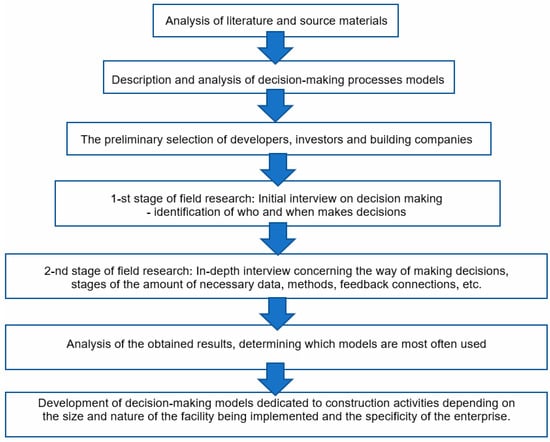 The research, the purpose of which was to develop decision models tailored to the specificity of construction activities, was carried out in 7 stages, including previously planned activities. The diagram of the research process presenting the research methodology is presented in Figure 5.
