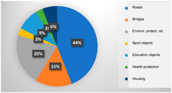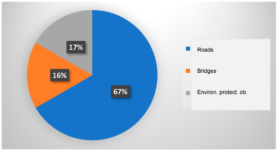 Among the analysed civil structures and decision situations connected with their execution, over 40% were road construction projects. Such a large proportion of new roads is the result of the rapidly growing road construction sector stimulated by the EU funds. The second most numerous type of civil engineering projects was the construction of environmental protection facilities. Same as roads, they were mostly built with the contribution of EU funds. Bridges as civil engineering constructions associated with road construction made up 15% of the analysed projects. Each of the remaining types of civil structures corresponded to less than 10% of the total. As many as 4 out of 6 large civil structures represented road structures. Participation in the study each type of objects is presented in the diagram in Figure 6, and the percentage share of various venture in the group of large objects chart in Figure 7.