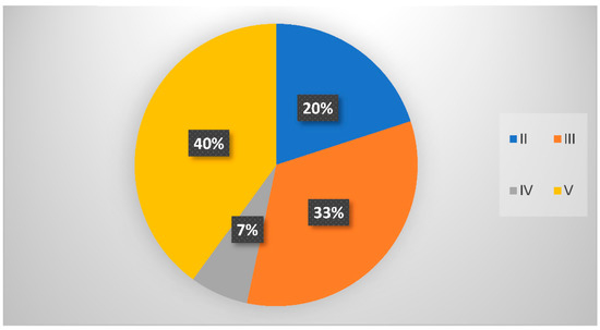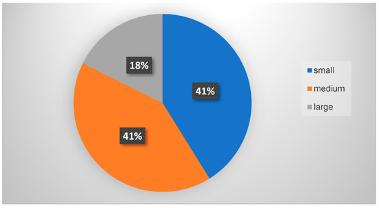 The research comprised 6 construction projects classified as large or as highly complex ones. There was the same number of medium-sized and small civil structures (14 civil structures). The percentage of these projects in the total analysed number is illustrated in Figure 8.