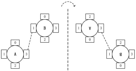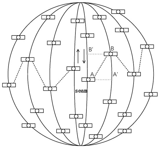 As shown in Figure 1, each satellite is connected to neighboring satellites through inter-plane ISLs and intra-plane ISLs. There are two seams between the two hemispheres, the satellites on both sides of the seam move in opposite directions and do not build links. The four intersatellite link interfaces of the satellites located in the western hemisphere are counted as 0, 1, 2, 3 in the counterclockwise direction from the north direction. As shown in Figure 2, when in the western hemisphere, satellite B communicates with the hetero-orbiting satellite A through its interface 1 and the interface 3 of satellite A. When the two satellites cross the polar region and enter the eastern hemisphere, they do not adjust their movement attitudes, but constantly adjust the positions of interface 1 and interface 3. Finally, in the eastern hemisphere, satellite B still communicates with satellite A through its interface 1 and the interface 3 of satellite A, and the positions of interface 1 and interface 3 are swapped at this time. During the entire process of crossing the polar regions, the inter-plane ISL always maintains link establishment status. From the perspective of routing, the length of the inter-plane ISL is constantly changing, and the link establishment status and the corresponding relationship between the interfaces are always constant.
