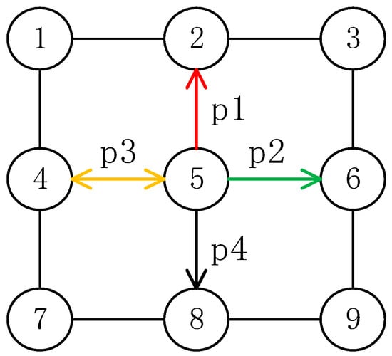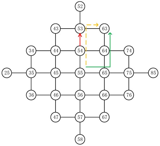 The space segment network topology is a mesh network structure. Each satellite in orbit is identified by an orbit number and a phase number. The relative position relationship between any two satellites at any time is determined and will not change, that is, between two satellites the orbital difference and phase difference are always the same. As shown in Figure 3, the current satellite node orbit number , phase number , destination node orbit number , phase number , the orbit difference between the current node and the destination node , phase difference . Data packets from the current node to the destination node need to pass through three hops of inter-plane ISLs and two hops of intra-plane ISLs. In this article, we refer to them as horizontal hops and vertical hops for short []. For any two source and destination satellites in the entire network, the direction of the horizontal hops and vertical hops can be determined.