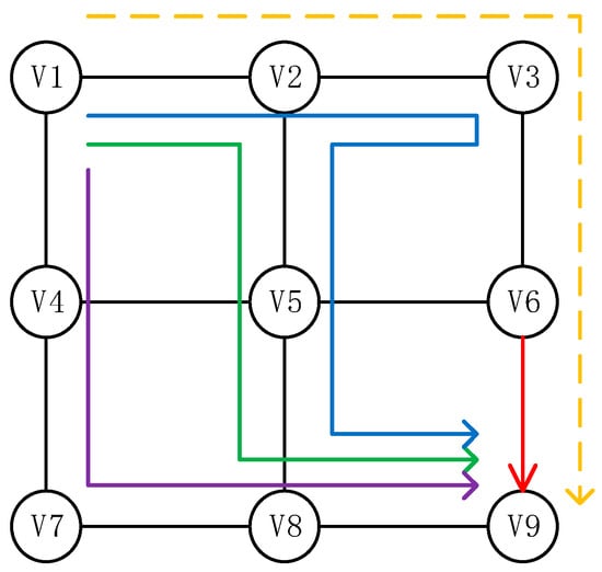 Since the services carried by the space segment network mainly go through three to four hops, we compared the routing performance of the strategies in which the link failure information is propagated to one hop, two hops, and three hops for the V1 -> V9 data flow in a 3 × 3 network topology. As shown in Figure 5, , , . The main path of V1 -> V9 is V1-V2-V3-V6-V9, and the failed link is V6-V9. Due to the long intersatellite link length, and the buffer size of the space router being relatively small compared to the laser link bandwidth, the transmission delay of the data packet is much smaller than the propagation delay. We take the propagation delay and the detour distance as the evaluation index of the detour path, the propagation delay , where is the total length of the intersatellite link that the detour path passes through, and is the speed of light, which is used to measure the quality of service provided by the detour path, while the detour distance is represented by the graphic area enclosed by the detour path and the main path, which is used to measure the load balancing capacity of the detour path for the intersatellite link.