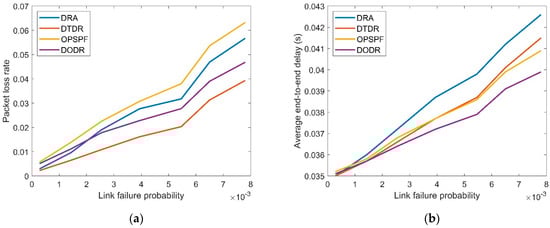 (a) Packet loss rate under different link failure probabilities; (b) average end-to-end delay under different link failure probabilities.