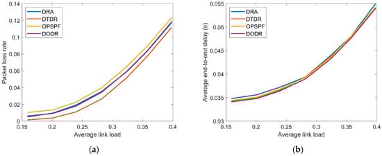(a) Packet loss rate under different average link loads; (b) average end-to-end delay under different average link loads.