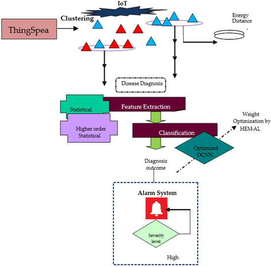 In this work, optimization algorithms play a key role in efficient disease diagnosis. Particularly, optimal centroid selection during the clustering process and weights of DCNN are also chosen during diagnosis. For this, a new HEM-AL model has been introduced that assists in attaining the defined objective function for optimal training. Figure 1 shows a pictorial representation of the presented IoT-based healthcare framework.