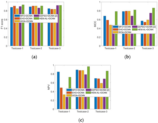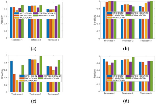 - As shown in Figure 4a, the presented HEM-AL + DCNN model has achieved better accuracy values (accurate diagnosis of disease), which show a 5.56%, 5.56%, 13.33% and 10% improvement over MFO + DCNN, EHO + DCNN, WOA + DCNN and EEPSO + DCNN models for test case 1.