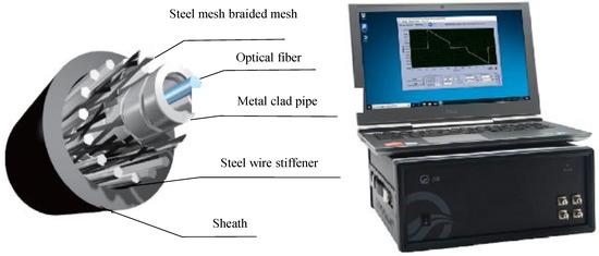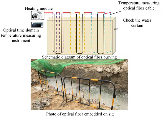 The fiber optic temperature measurement system was set up by using DTS-10 (Manufactured by Beijing TOP Photonics Co., Ltd.) copper network internal heating temperature sensing fiber optic cable and OFDR (OSI-C) high precision distributed optical frequency domain strain temperature analyzer [28], as shown in Figure 1. The fiber optic temperature measurement system was used after the construction of the foundation pit enclosure structure is completed (before the excavation of the foundation pit). Details of fiber optic deployment and on-site detection are shown in Figure 2. OFDR (OSI-C) analyzer can achieve a spatial resolution of 1 mm within 50 m sensing range and a resolution of 1 cm within 100 m sensing range, which guarantees high precision detection of leakage points in this project.